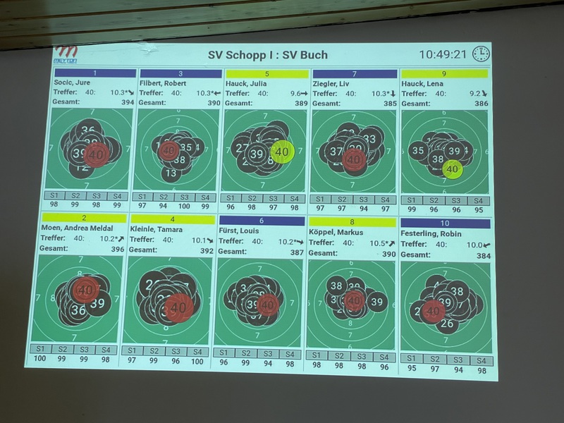 den SV Rötenbach in das 2. Match. Die Schützen legten alle noch eine Schippe drauf und gewannen mit 4:1. Auch hier punktete Johanna mit 399 Ringen, Lena mit 393, Julia mit 395 und Eva mit 388 Ringen.