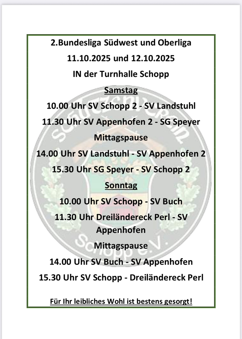 Dies bedeutet, dass der SV Schopp mit seiner 2. Mannschaft ungeschlagen auf Platz eins der Tabelle steht und somit auch vorzeitig Meister der Oberliga des Pfälzischen Sportschützenbundes ist. Trotz des noch ausstehenden Wettkampftages im Januar kann die Mannschaft unter Trainer Morgenstern Ulrich nicht mehr eingeholt werden. Somit können die Schützen ohne Druck auf ihren letzten Kampf in Jockgrim am 18.01.2026 blicken.